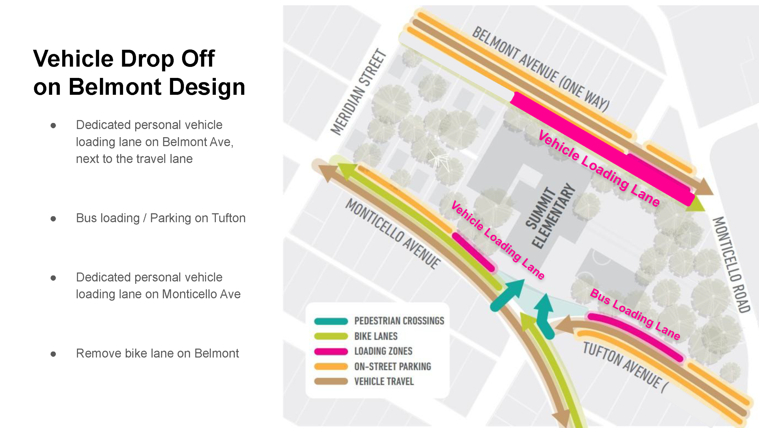 City and CCS staff determined that Dedicated Drop-Off Lane on Belmont Ave addresses the most urgent safety concerns, and can adjust based on feedback