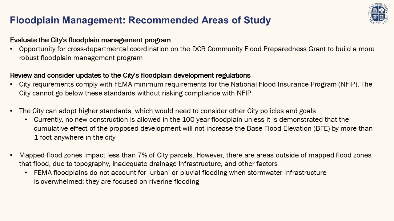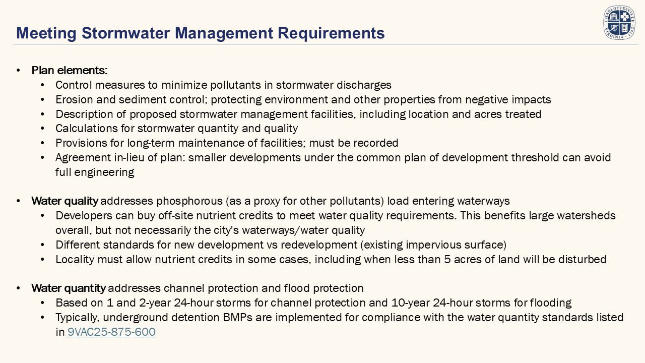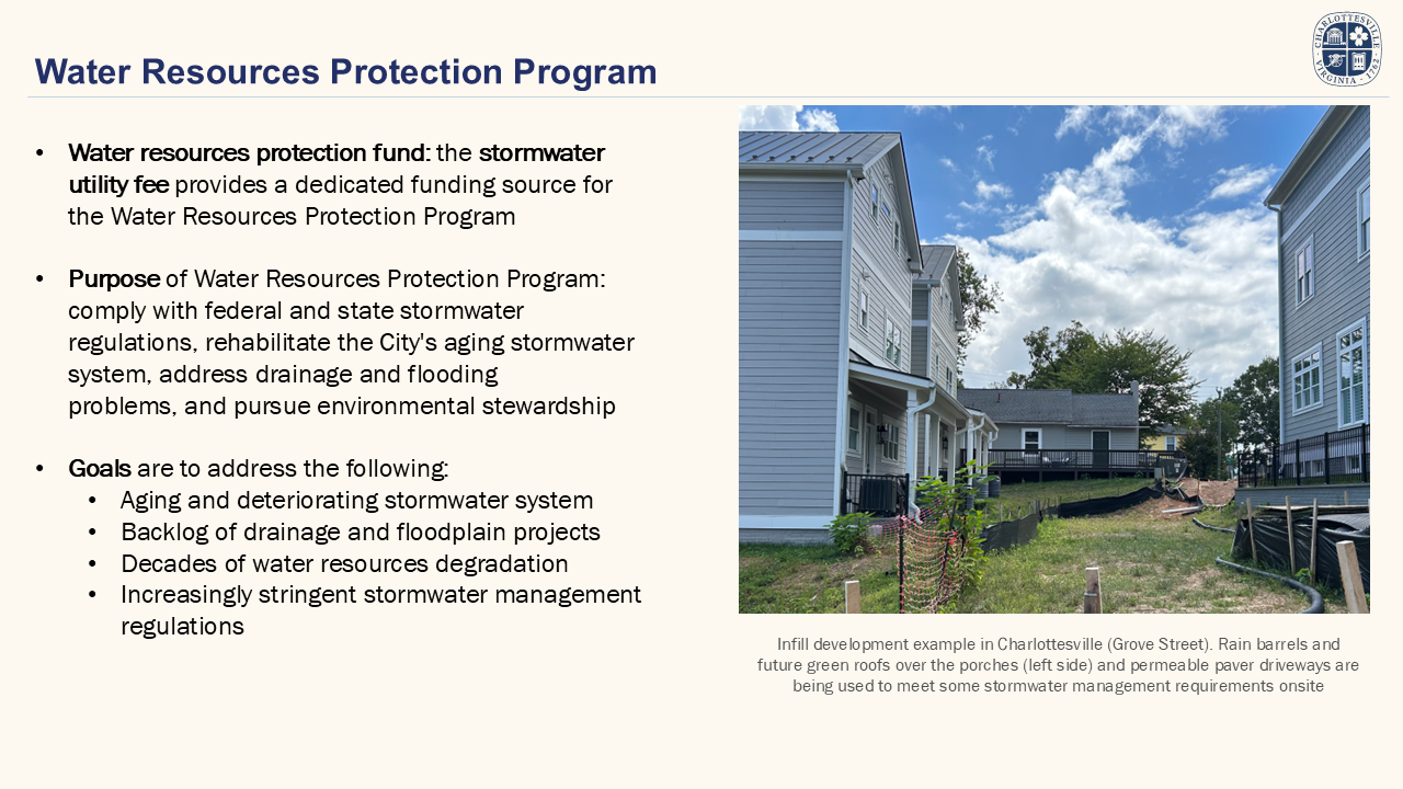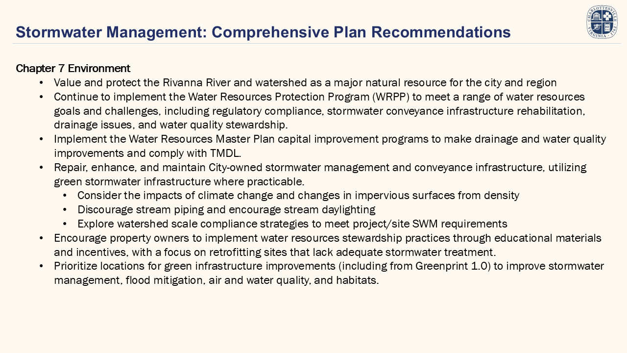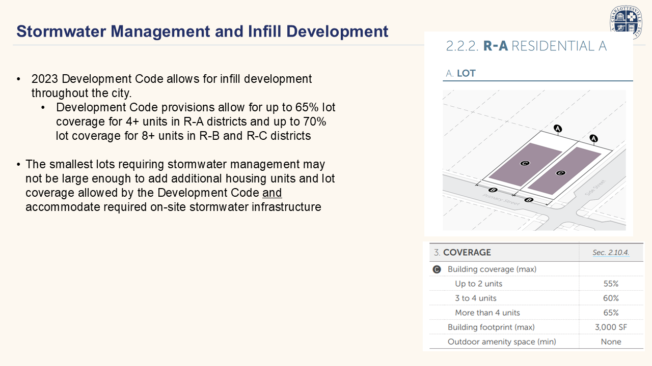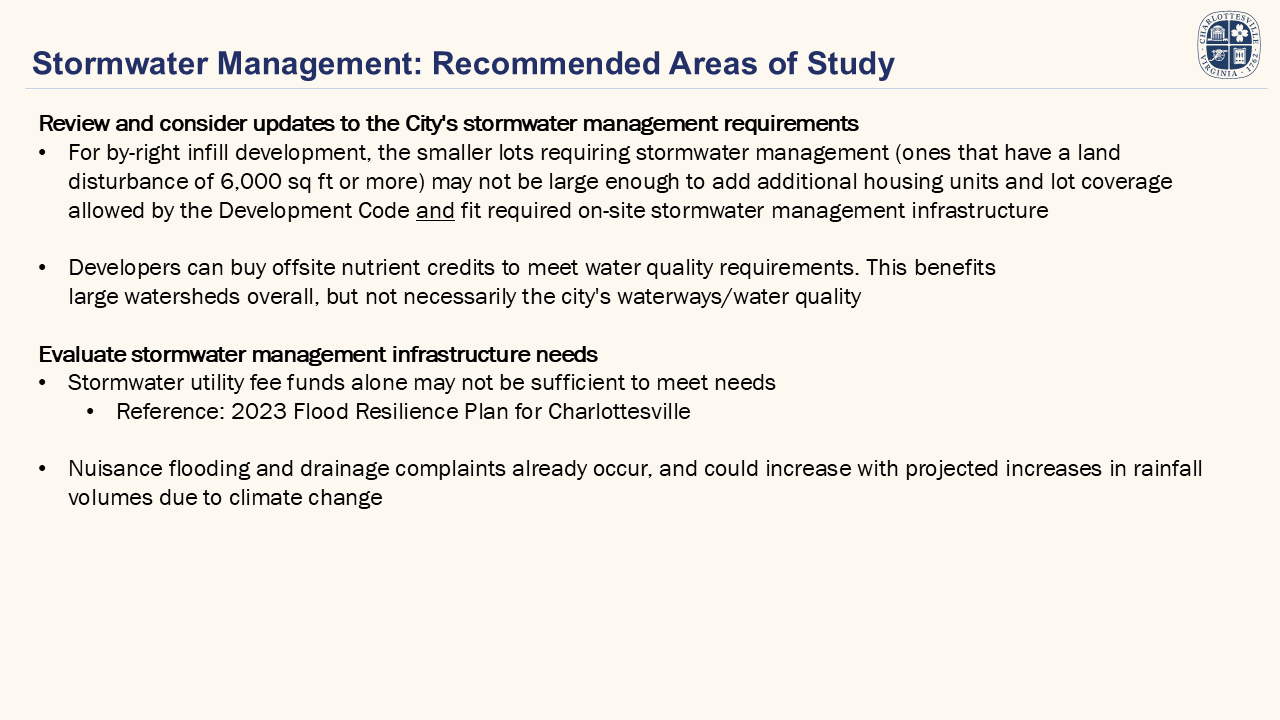 - Updates to stormwater management regulations that improve the feasibility of infill development while also increasing the use of onsite measures for water quality (e.g. rain barrels, green roofs)