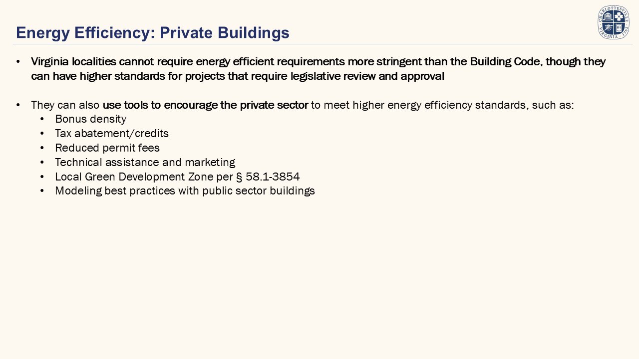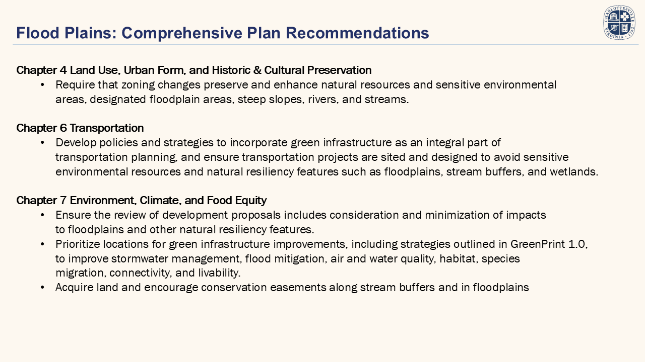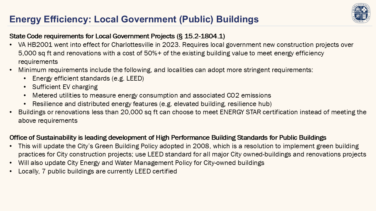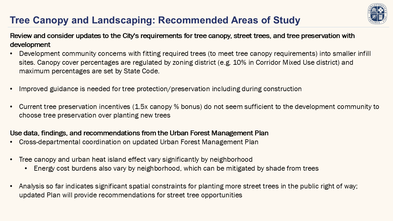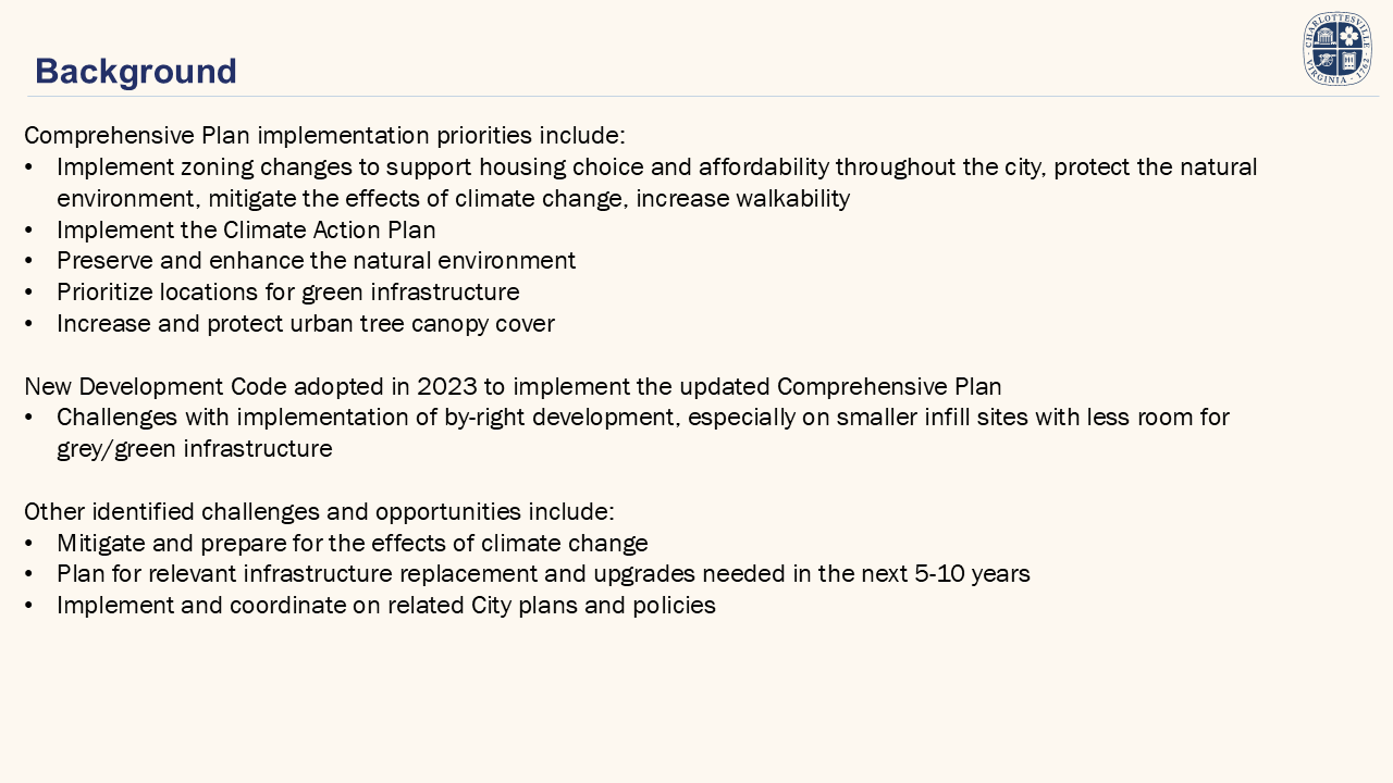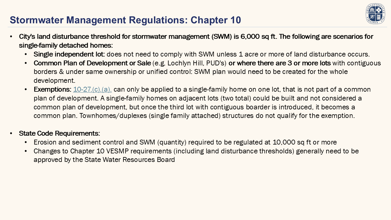 - Updates to stormwater management regulations that improve the feasibility of infill development while also increasing the use of onsite measures for water quality (e.g. rain barrels, green roofs)