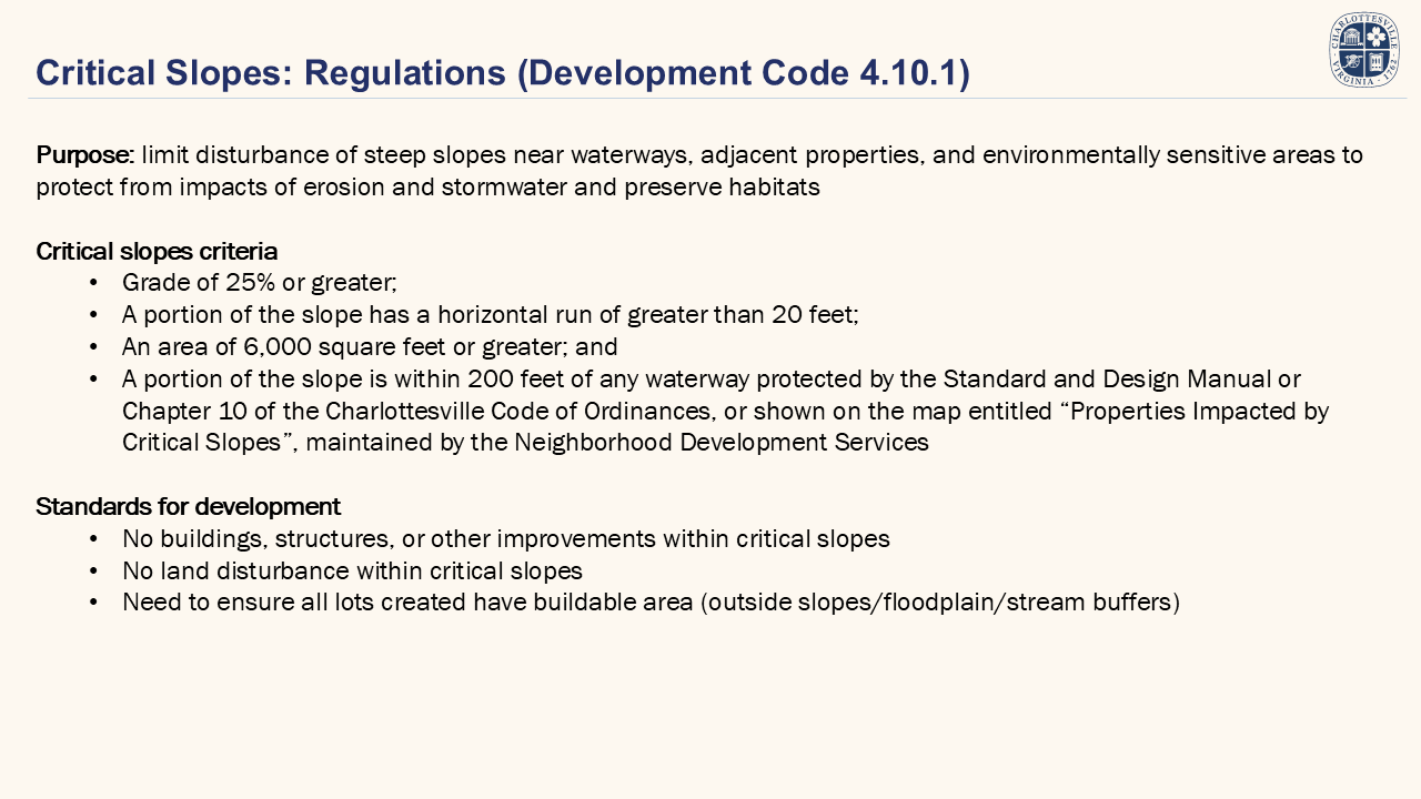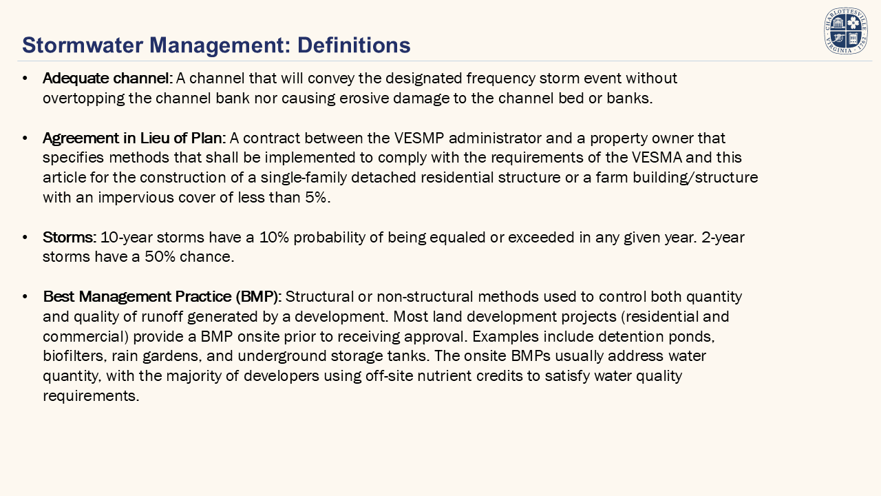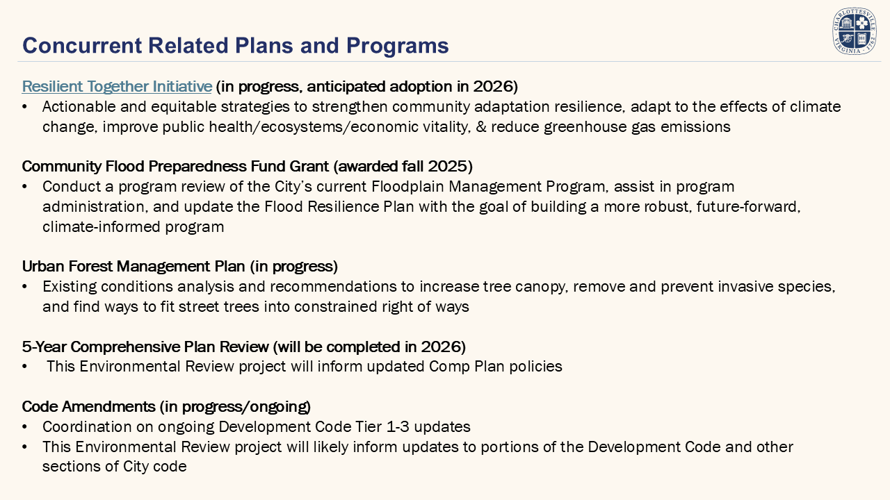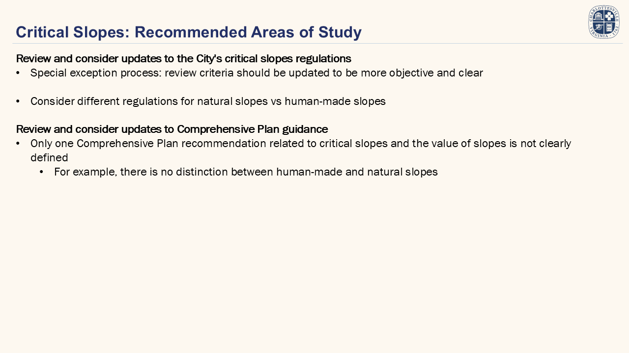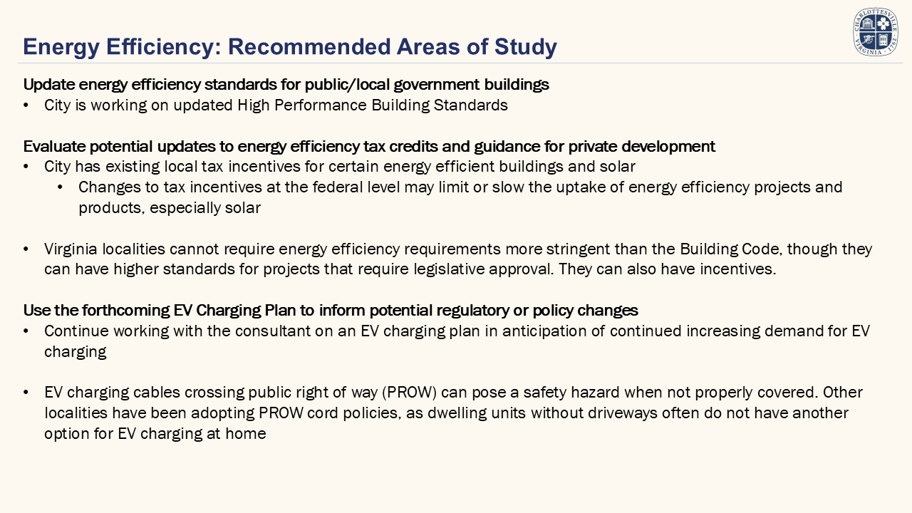 - Updates to stormwater management regulations that improve the feasibility of infill development while also increasing the use of onsite measures for water quality (e.g. rain barrels, green roofs)