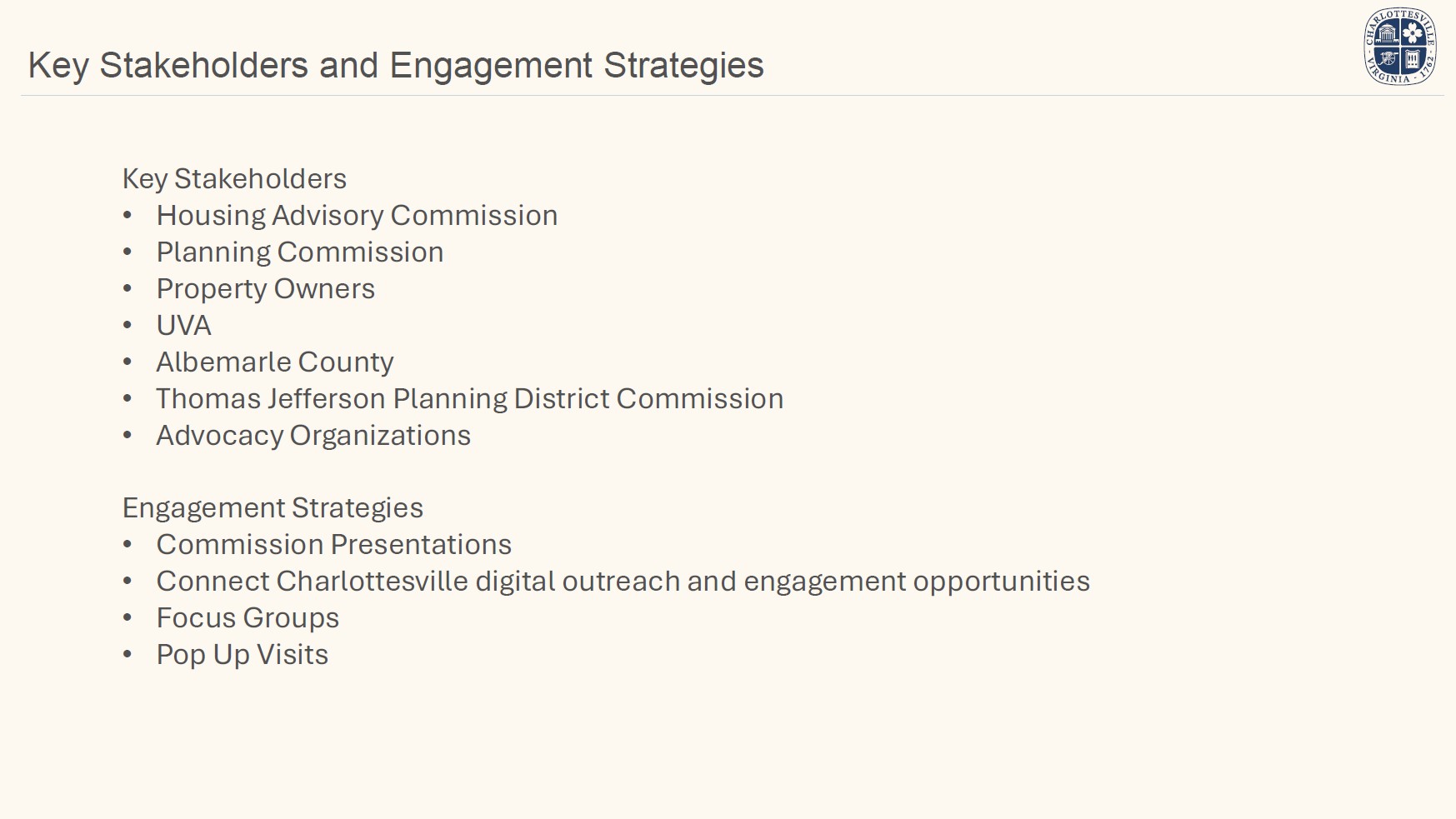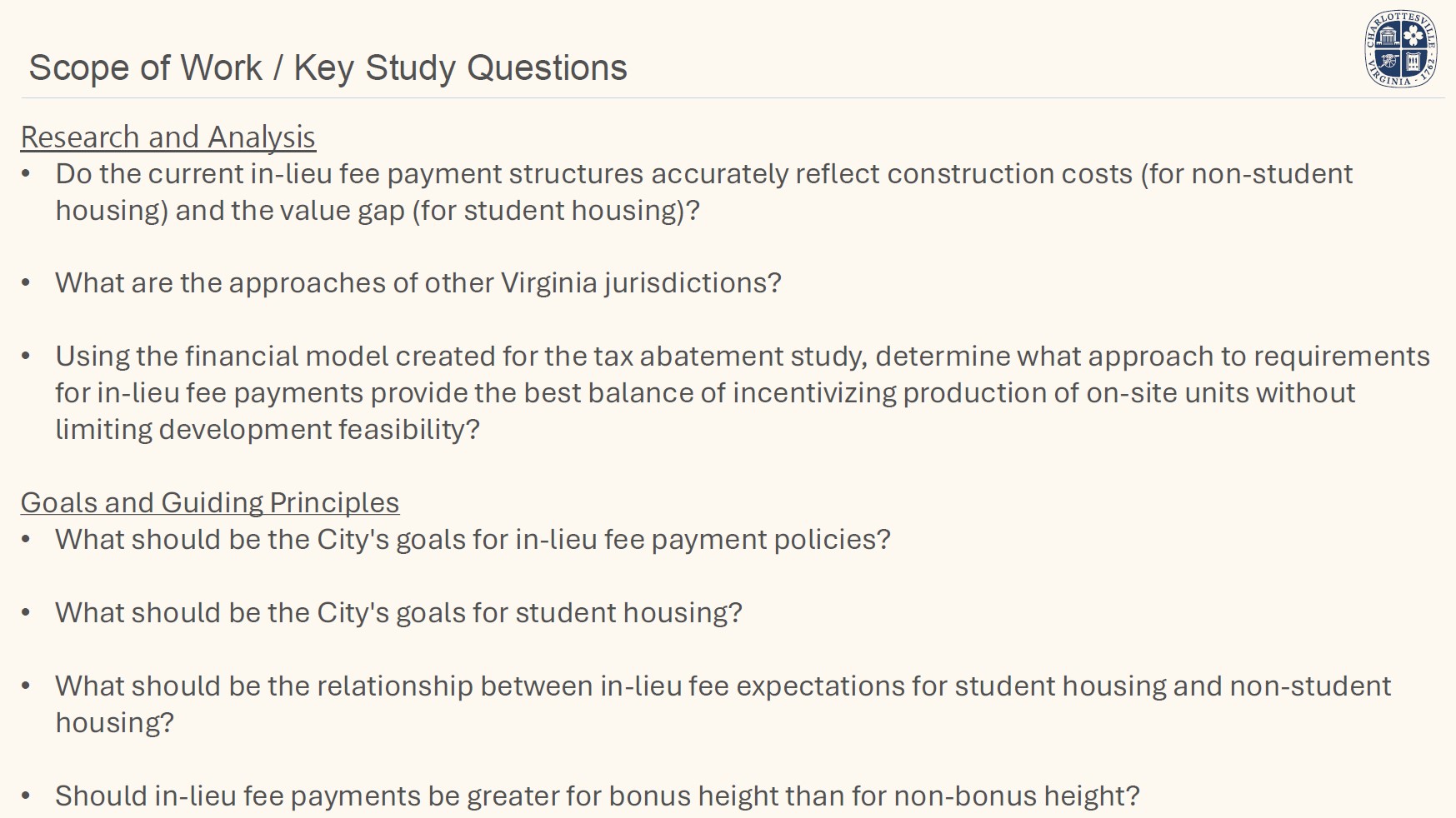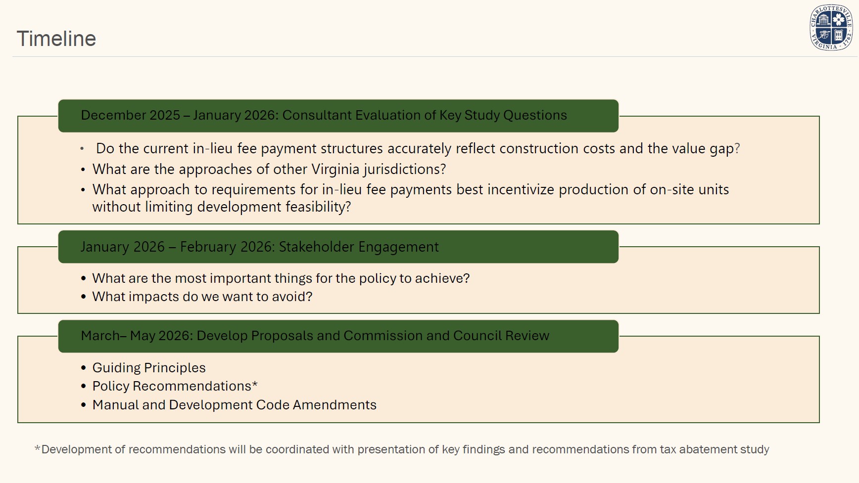 On January 13, 2026, staff presented an overview of the proposed scope and key questions for the study to the City's Planning Commission. On January 20, staff will present the same overview and questions to City Council at their regular meeting. In early 2026, staff will seek stakeholder input on guiding principles to inform policy recommendations.