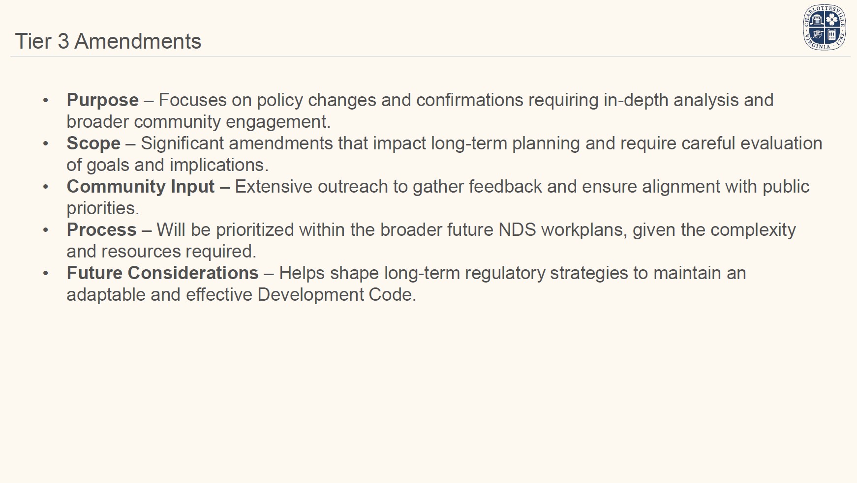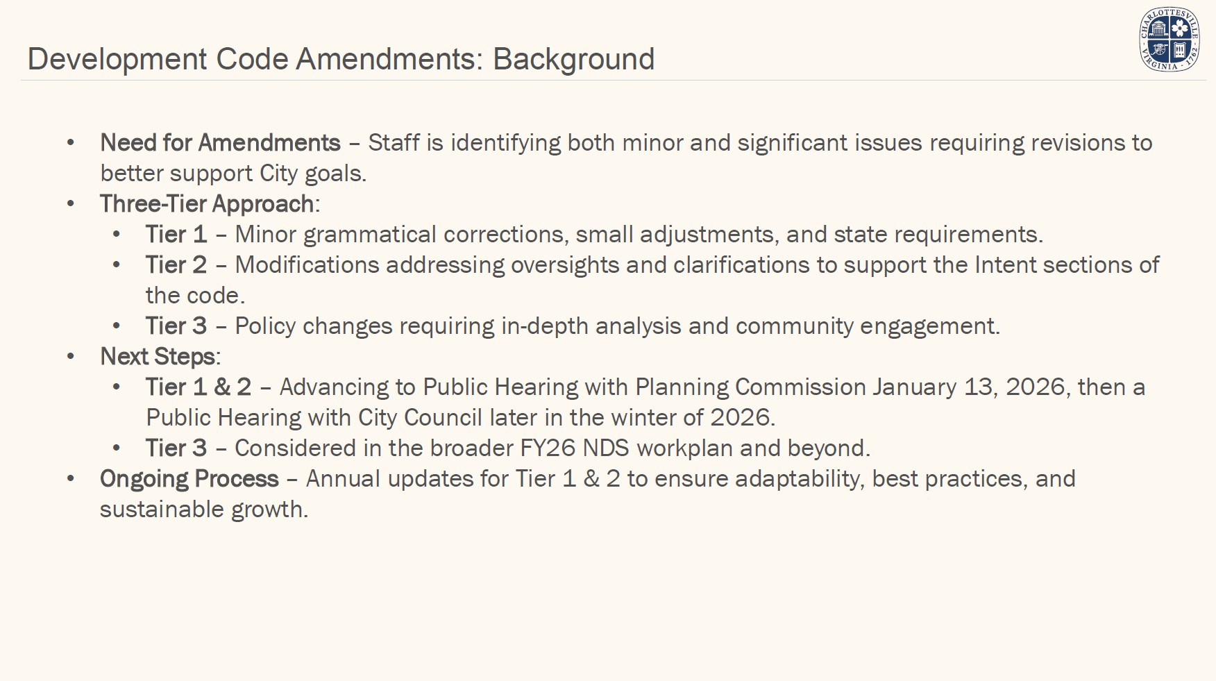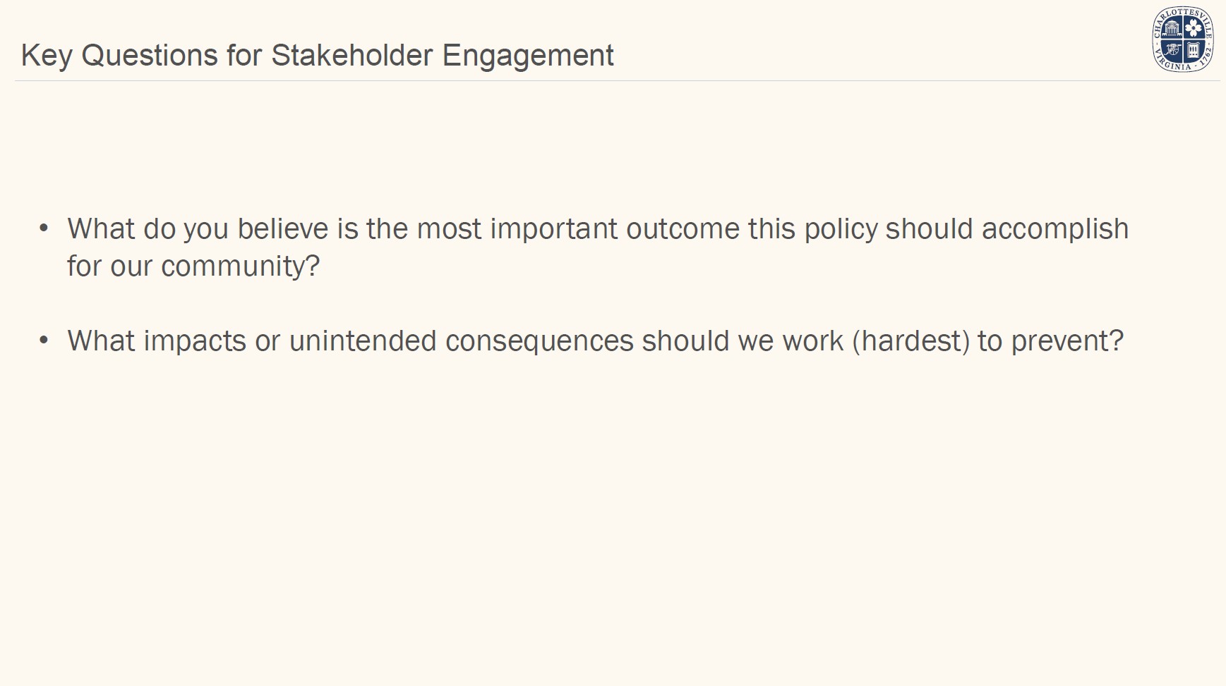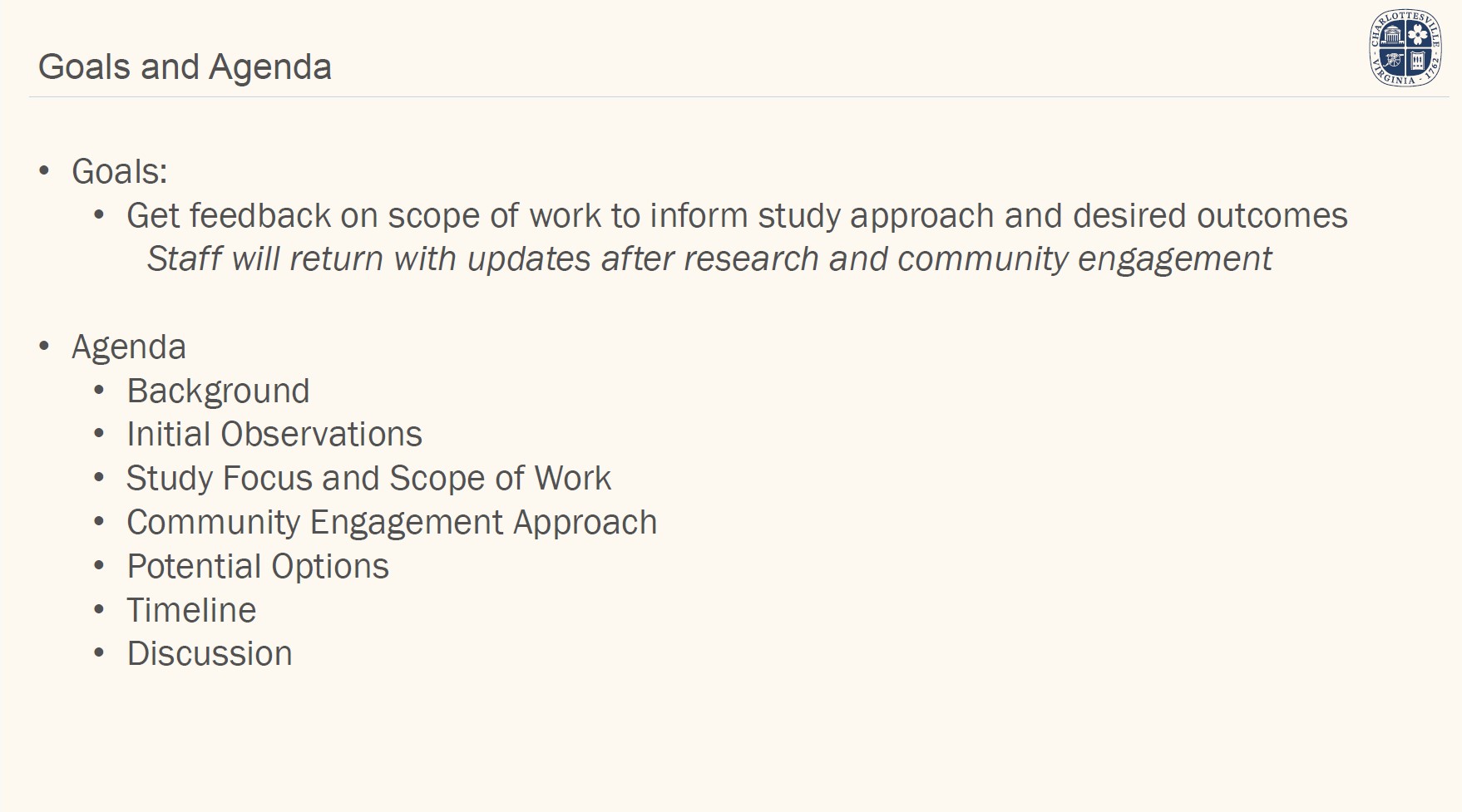 On January 13, 2026, staff presented an overview of the proposed scope and key questions for the study to the City's Planning Commission. On January 20, staff will present the same overview and questions to City Council at their regular meeting. In early 2026, staff will seek stakeholder input on guiding principles to inform policy recommendations.