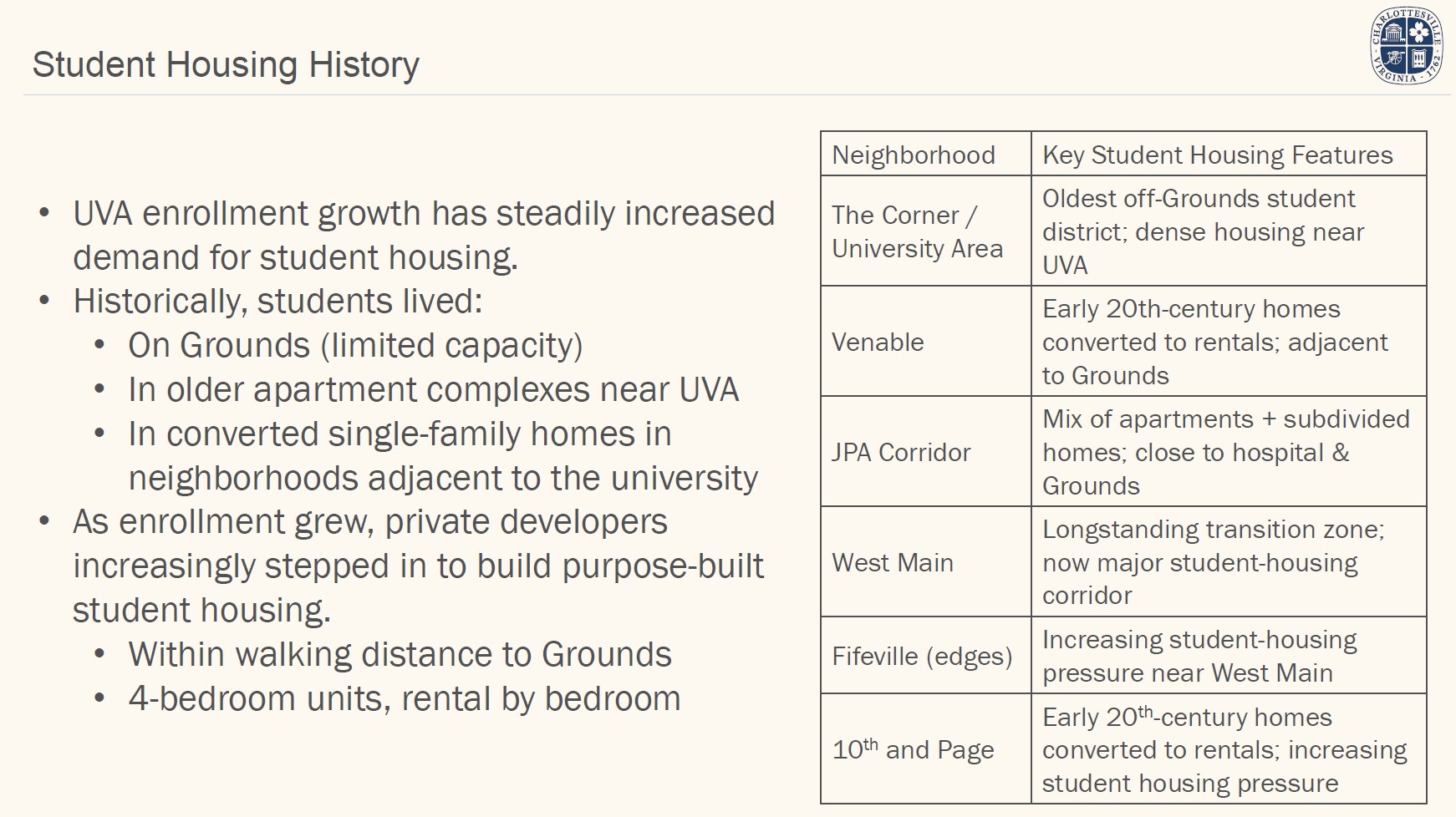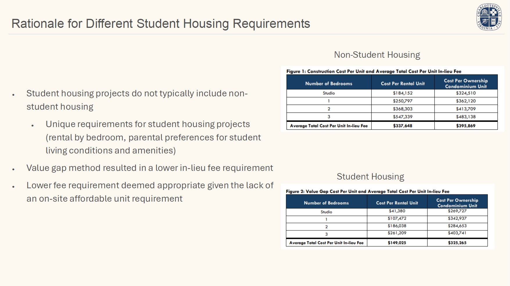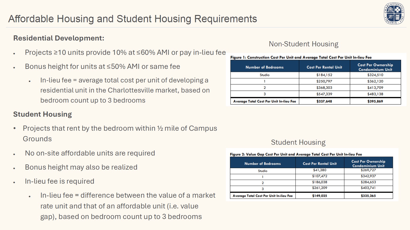 Student Housing is allowed in all districts where housing is allowed. However, in student housing projects within 1/2-mile of the University of Virginia campus grounds that lease on a per bedroom basis, no on-site affordable units are required and applicants must pay an in-lieu fee.