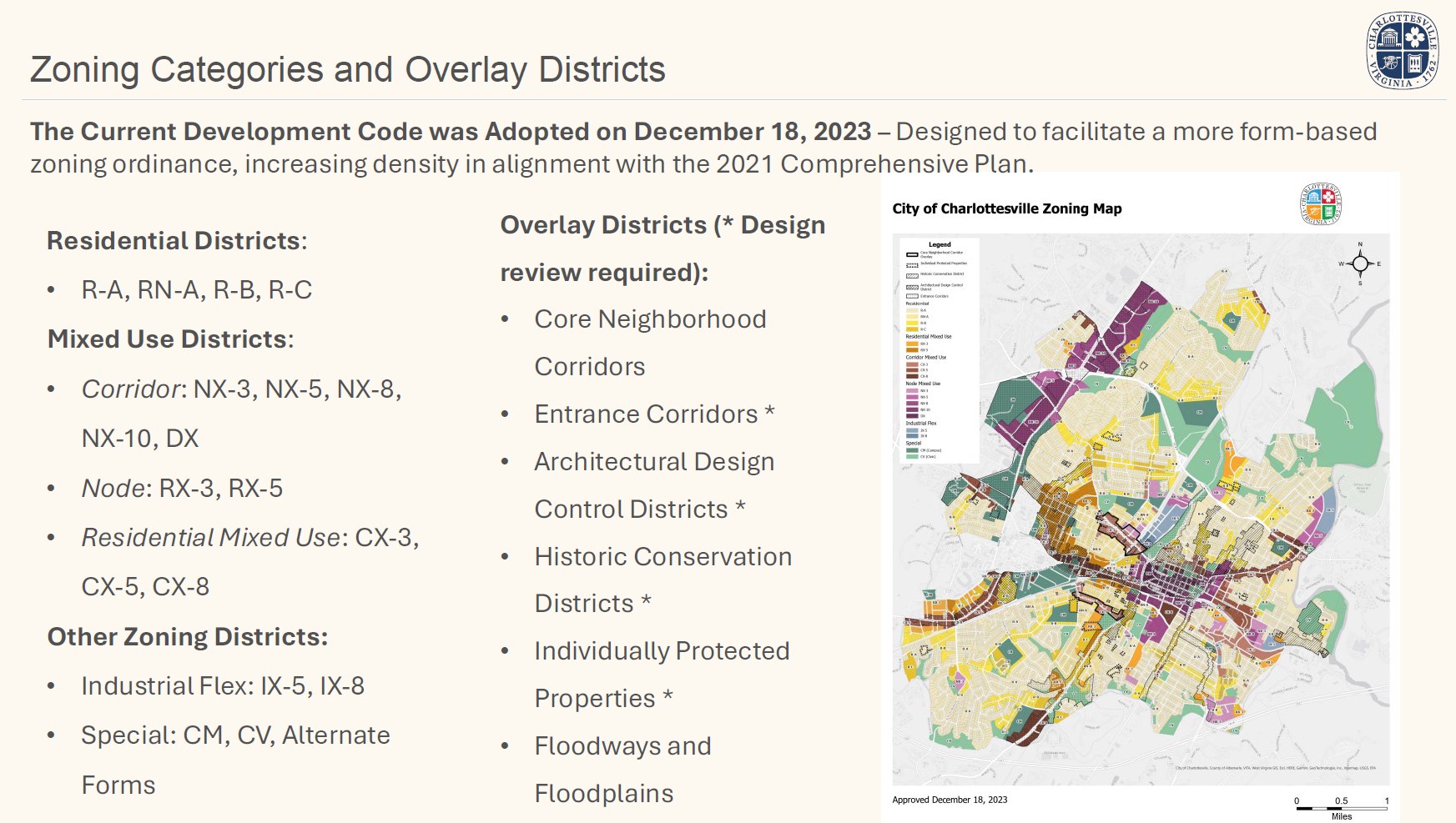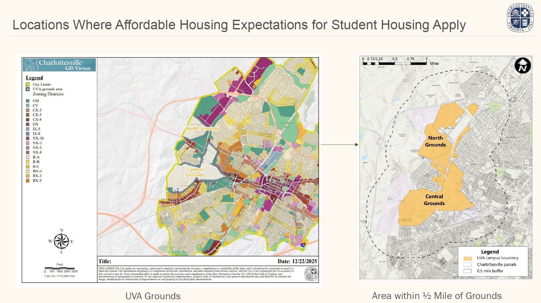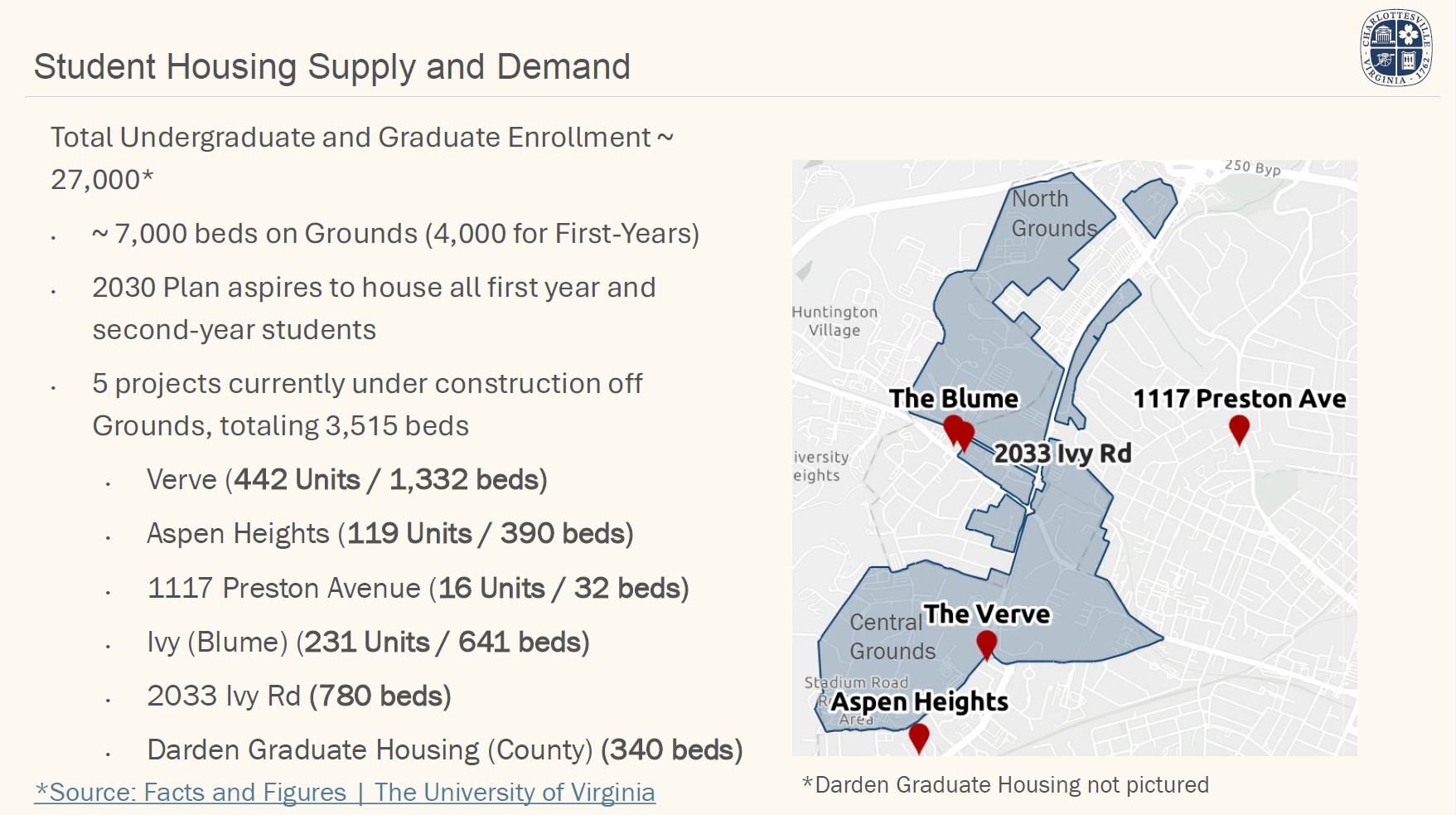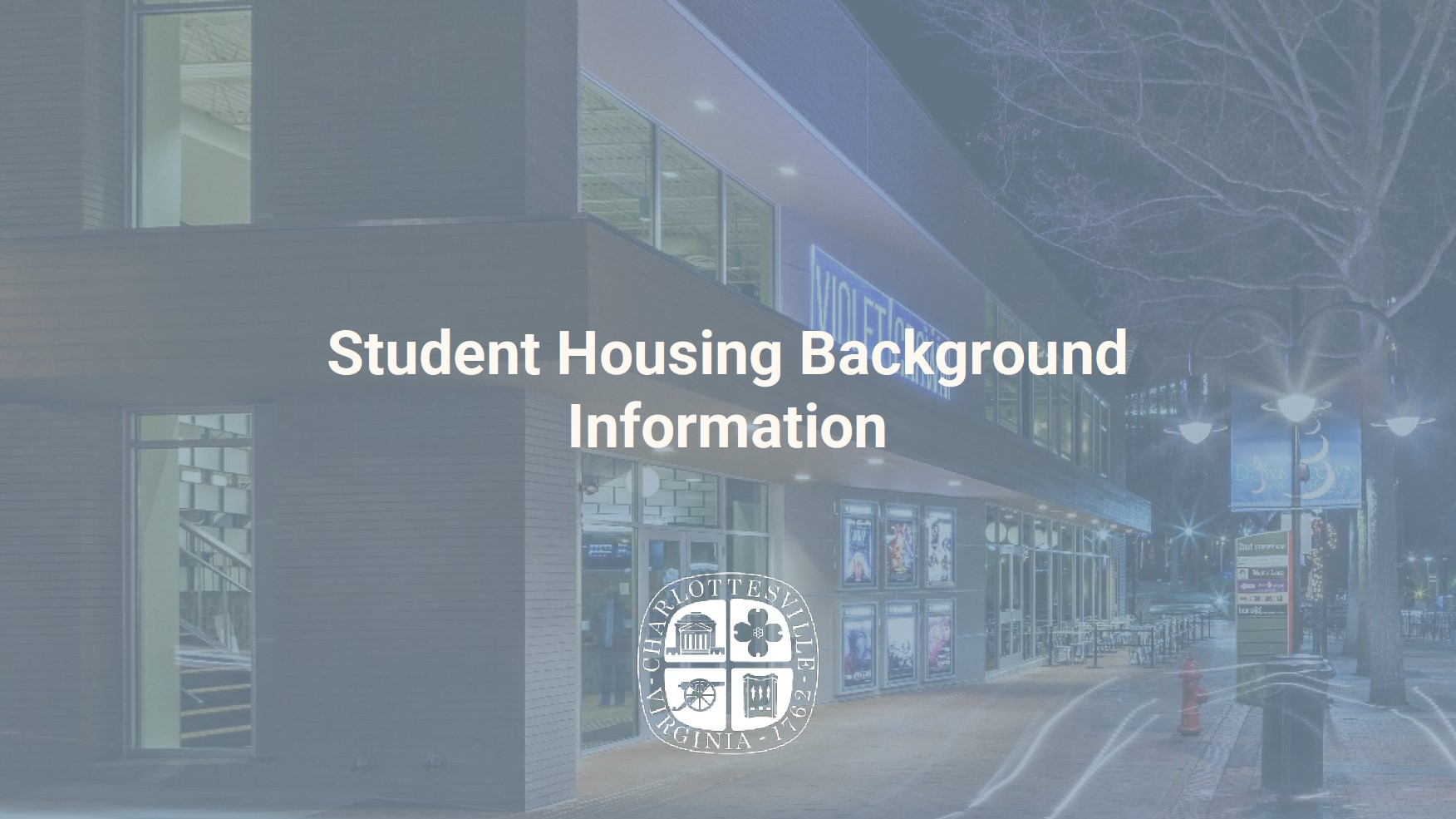 Student Housing is allowed in all districts where housing is allowed. However, in student housing projects within 1/2-mile of the University of Virginia campus grounds that lease on a per bedroom basis, no on-site affordable units are required and applicants must pay an in-lieu fee.