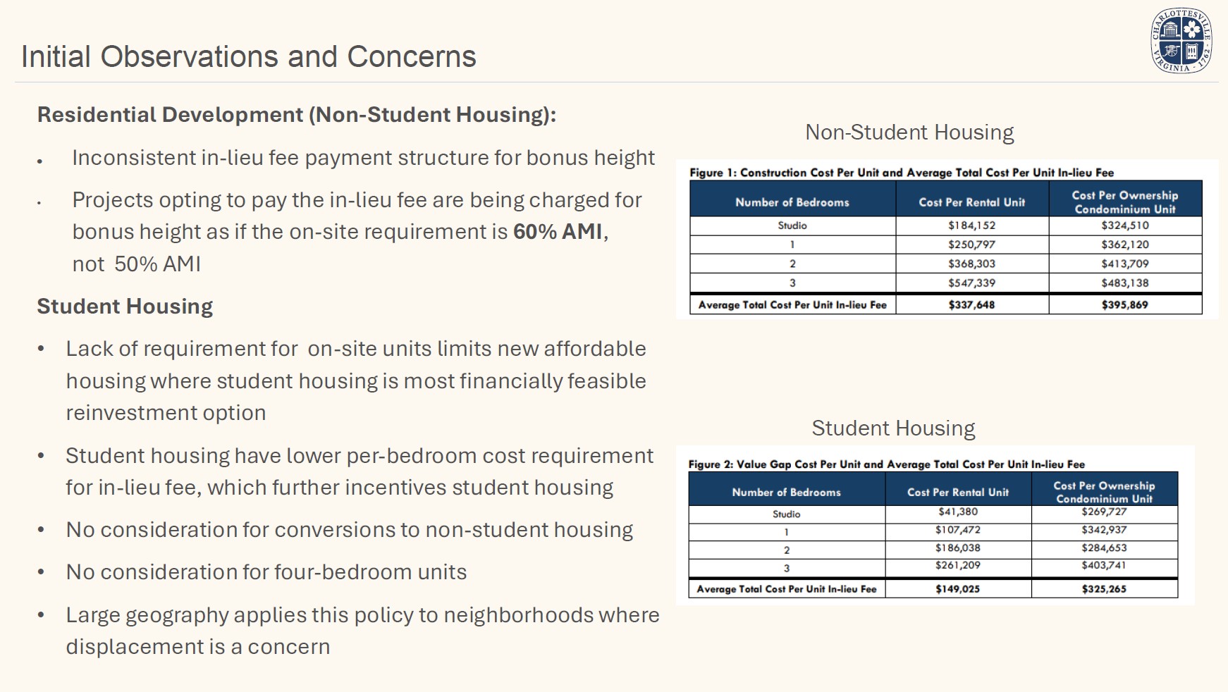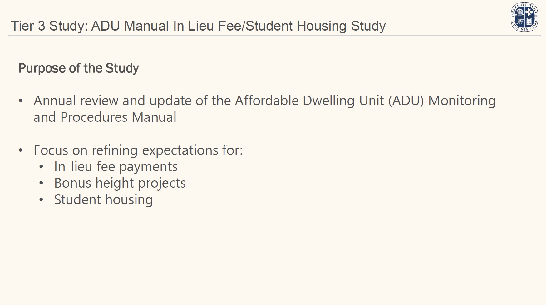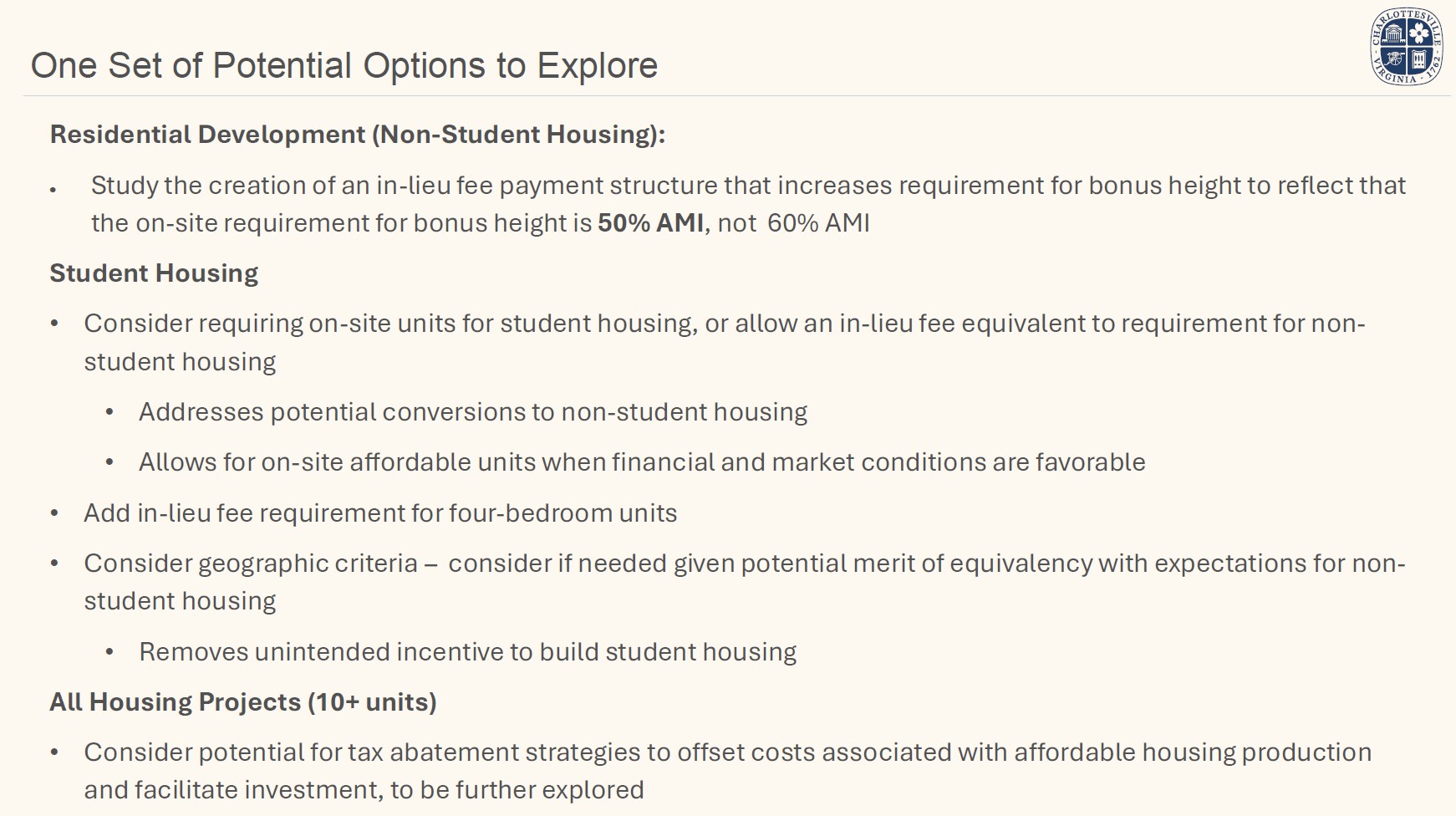 The geographic extent of student housing affordable housing requirements will also be evaluated.