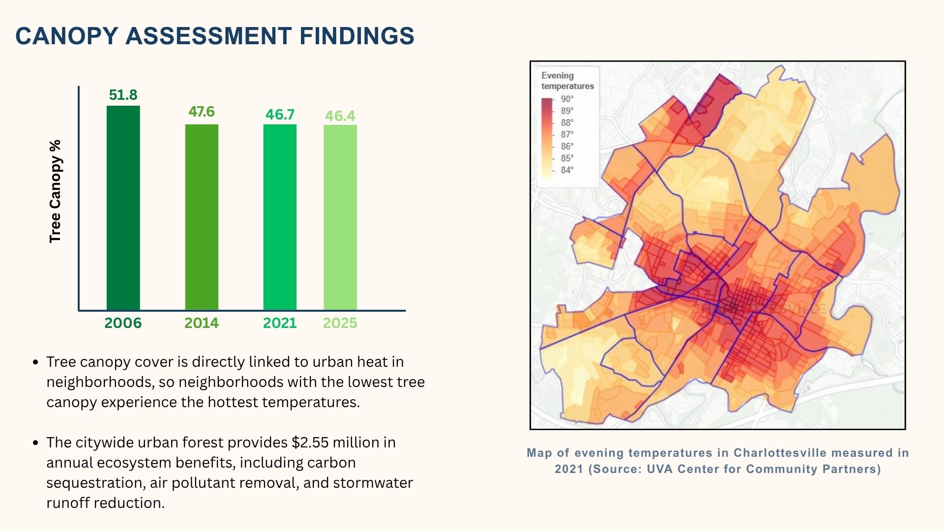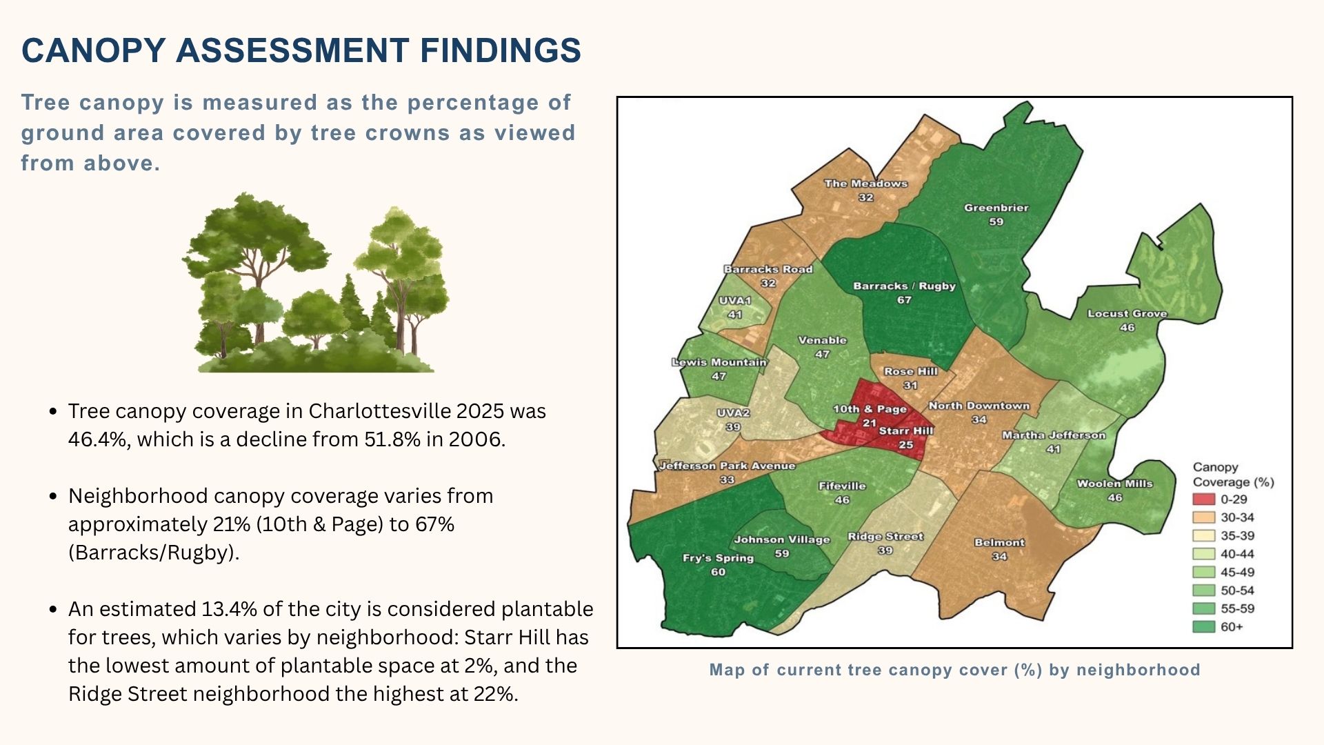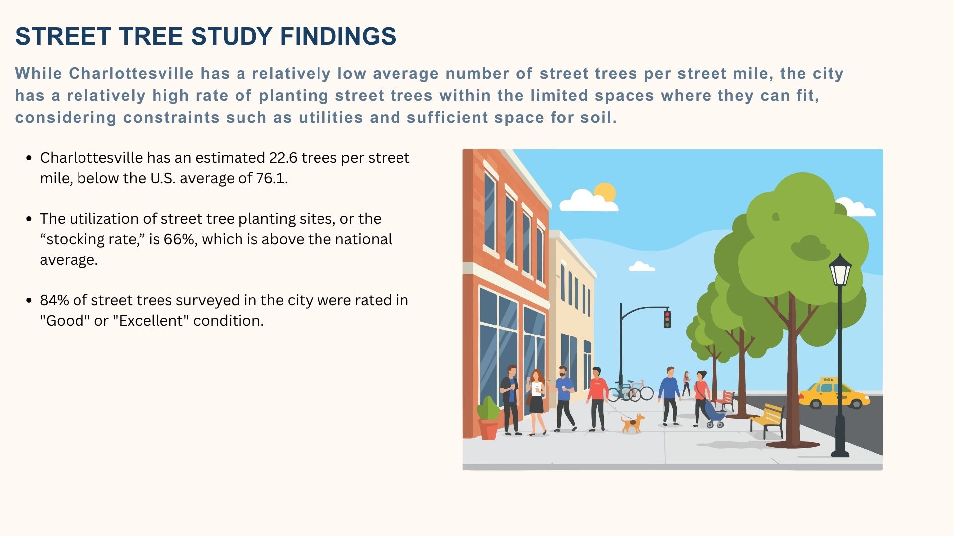 The City of Charlottesville is working with Eocene Environmental Group to develop an updated Urban Forest Management Plan (UFMP). The UFMP will provide recommendations for street trees, prioritizing tree planting locations, tree preservation and maintenance, and tree canopy expansion on both public and private properties.