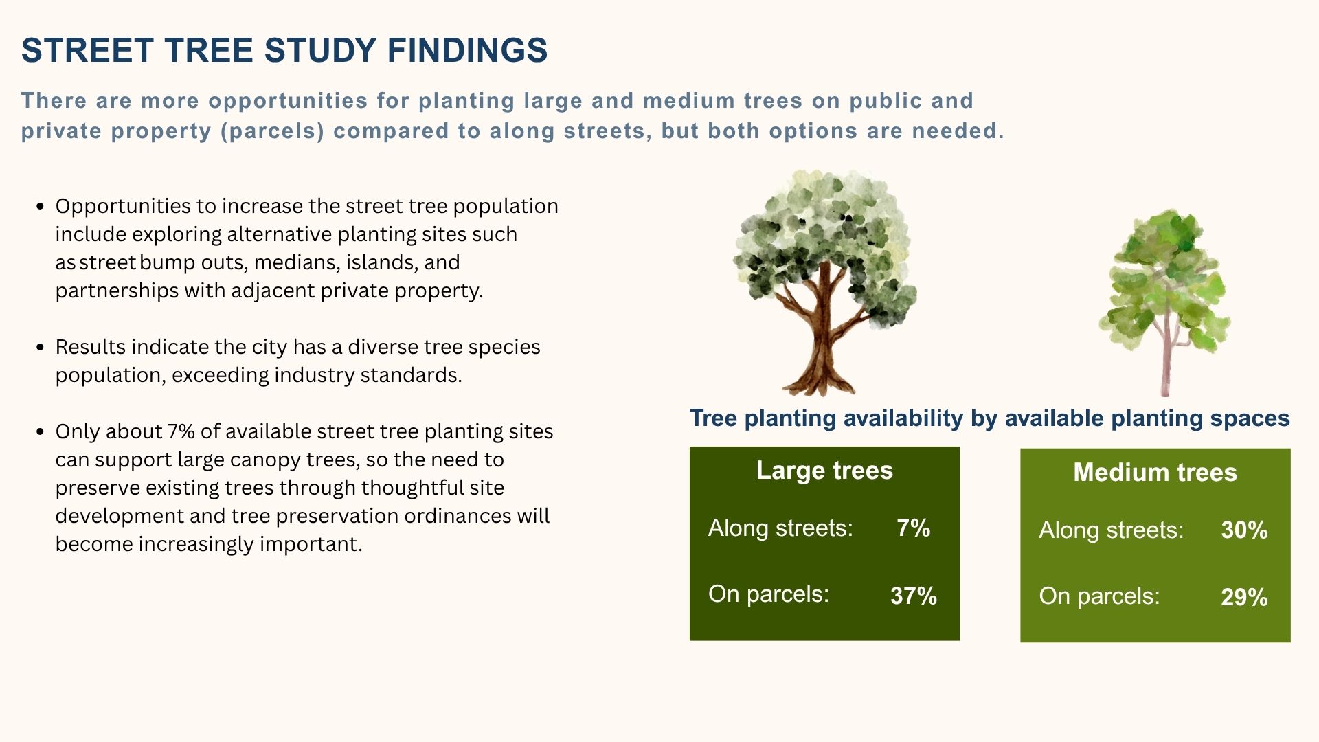 The City undertook a comprehensive urban forestry assessment in 2025 to evaluate its current tree canopy, street trees, and vegetation across public and private lands. This study aimed to inform policy, prioritize planting, and guide future management by integrating three components: a high-resolution tree canopy analysis using historical and current data, a street tree survey, and a citywide vegetation assessment. Below are some key findings: